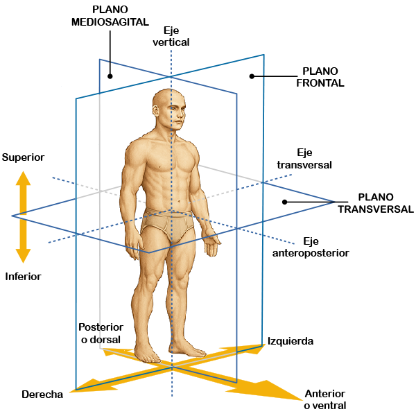 | Plano medio-sagital | Es un plano vertical que atraviesa el cuerpo de adelante hacia atrás | Divide al cuerpo en dos mitades: izquierda y derecha |